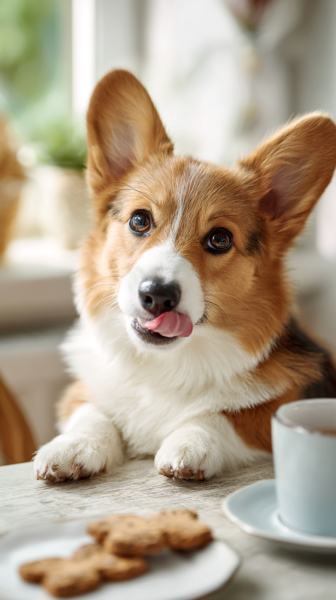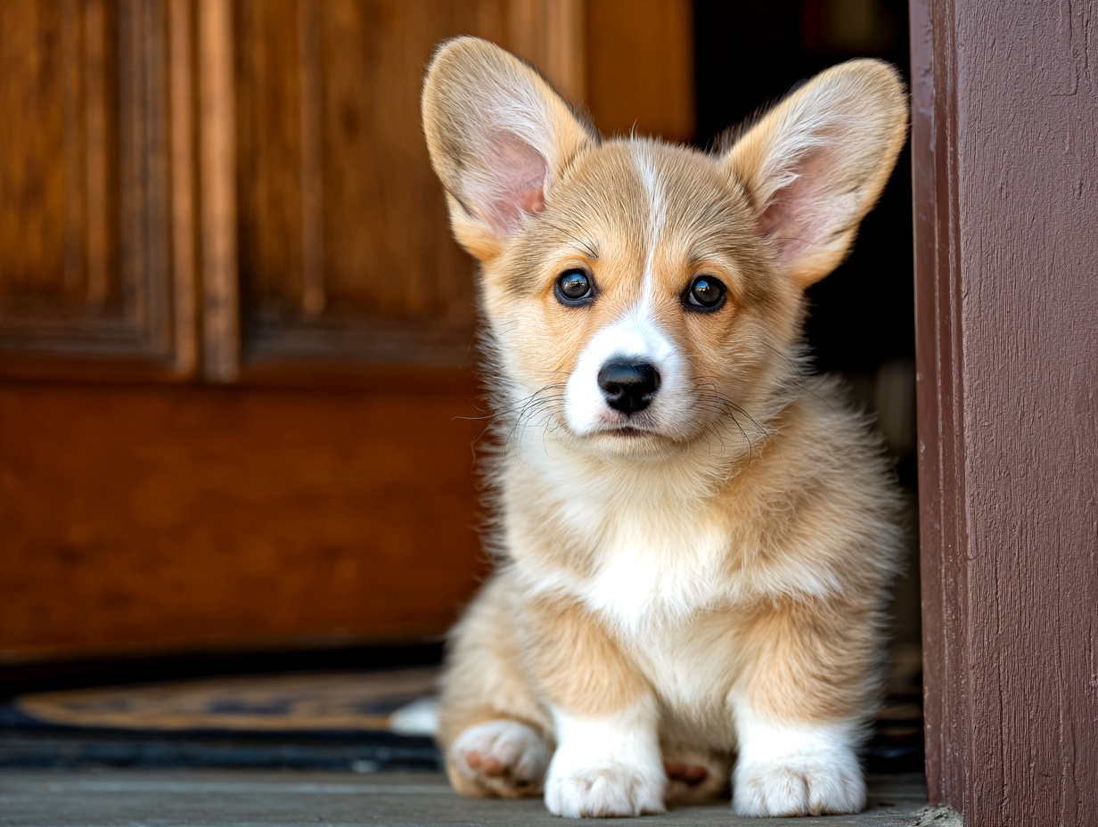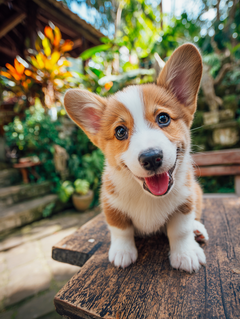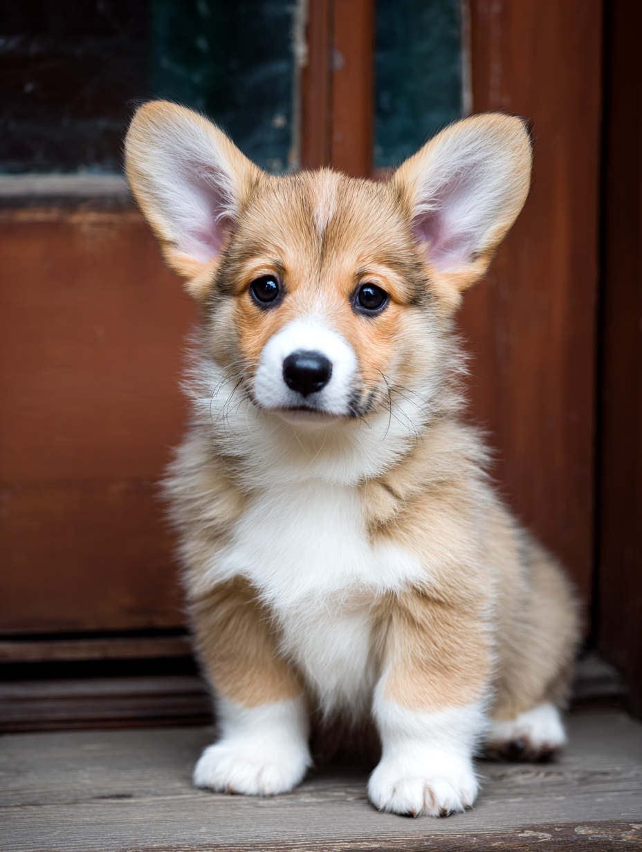 Adorable Pembroke Welsh Corgi puppy happily running down a rustic country road, holding a small twig in its mouth, bright and vibrant cinematic lighting, golden hour sunlight creating a warm glow, soft bokeh background with blurred trees and mountains, low angle shot, action freeze frame, photorealistic, highly detailed fur texture, shot on 35mm lens, f/1.8, 8k --ar 4:3 --v 6.0
