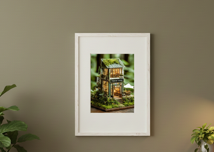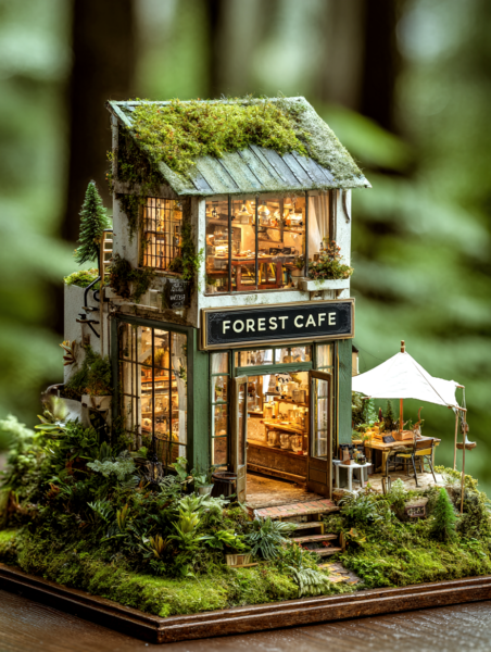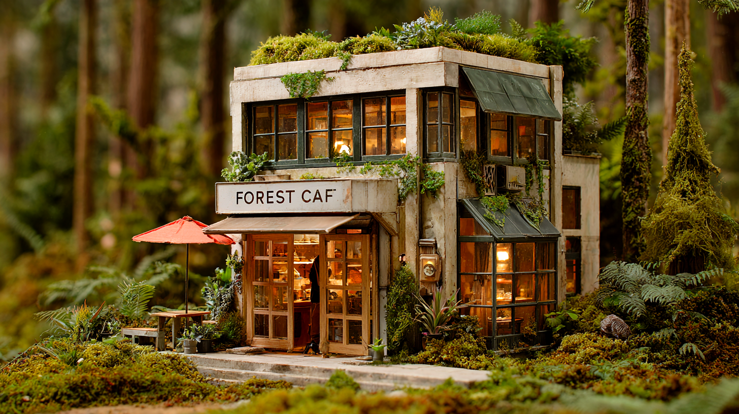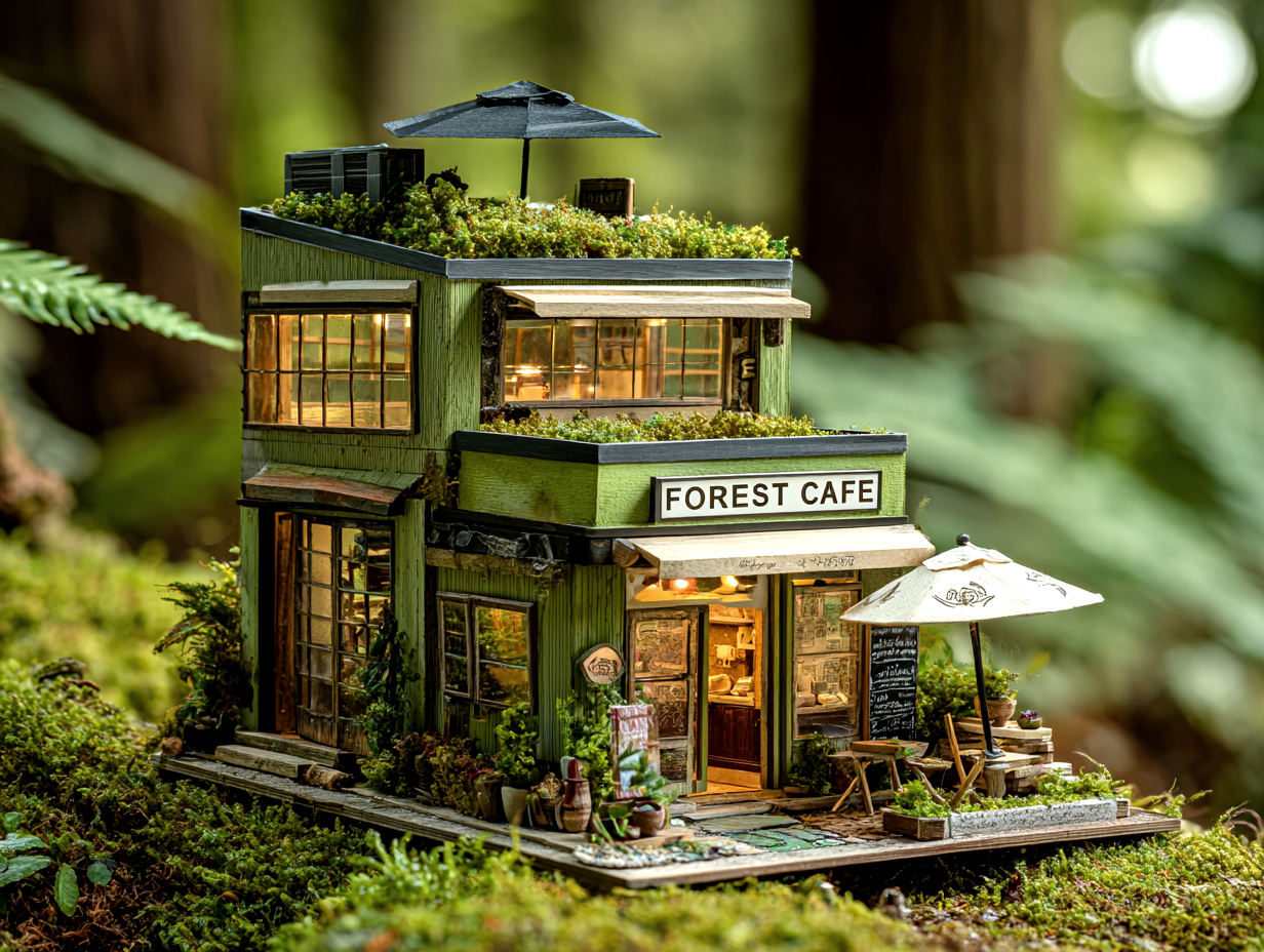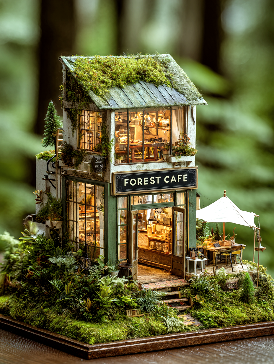 **Forest Cafe** -- a miniature architectural model, highly detailed, two-story building with a vibrant **green metal roof** and floor-to-ceiling windows, open entrance on the right. A cozy outdoor patio with a beige tent is visible in the back. The model is carefully placed on a bed of bright **green moss and short grass** inside a majestic forest, with sunlight filtering through the canopy (**God rays**). **Soft focus**, **tilt-shift photography**, **ultra-realistic texture**, **warm interior lighting**. --ar 1:1 --v 6.0