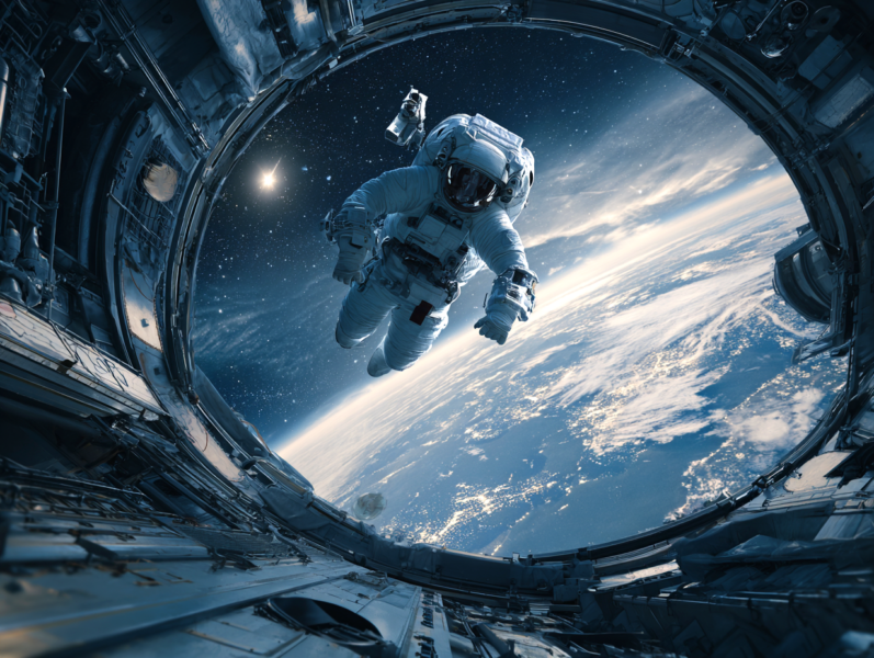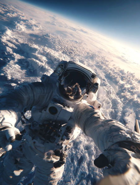 Two astronauts wearing white EVA space suits performing maintenance work on the International Space Station, both secured with visible safety tethers attached to their bodies, one end of the tethers connected to the ISS structure. The camera is positioned directly in front of the astronauts, capturing them from a close, wide-angle perspective. Behind them, the vast blue Earth with swirling white clouds is clearly visible and appears upside down, filling the entire background. Ultra-realistic space photography, cinematic lighting, 35mm film look, shallow depth of field, high dynamic range, photorealistic, immersive realism as if standing right in front of them, NASA-style spacewalk, detailed textures, natural colors, no illustration, no CGI --ar 16:9 --v 6 --style raw