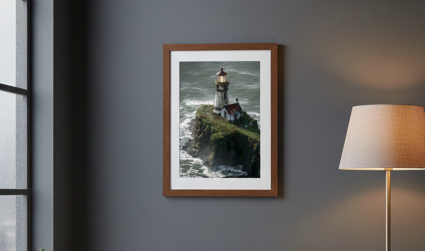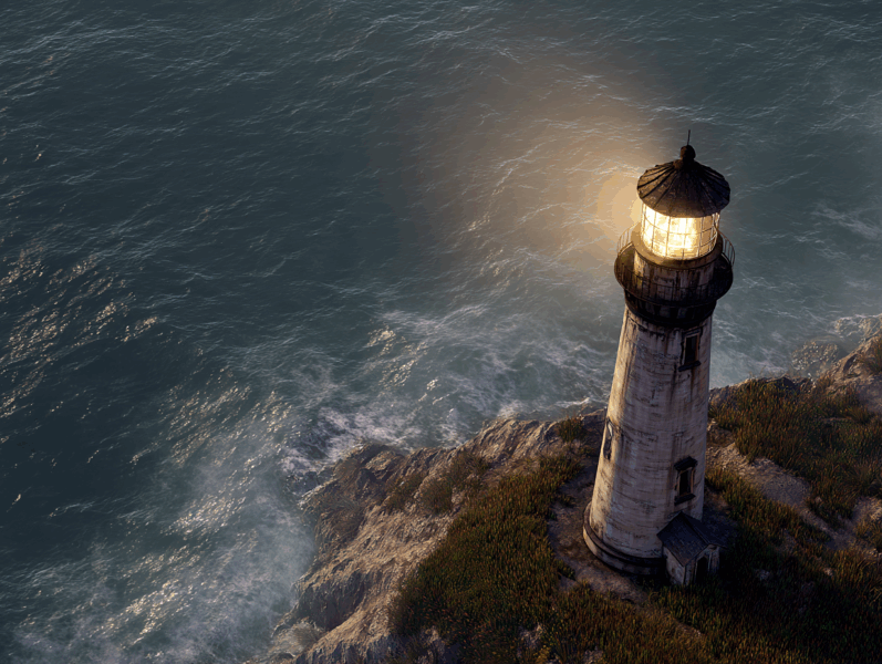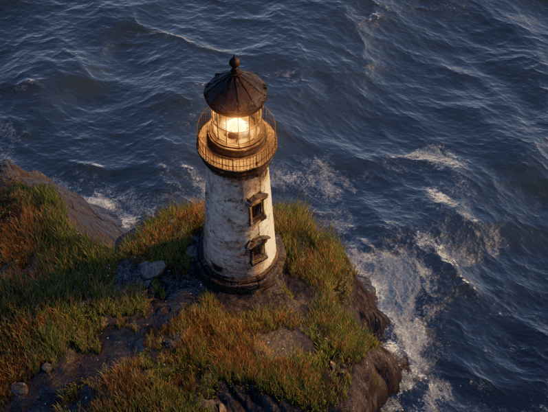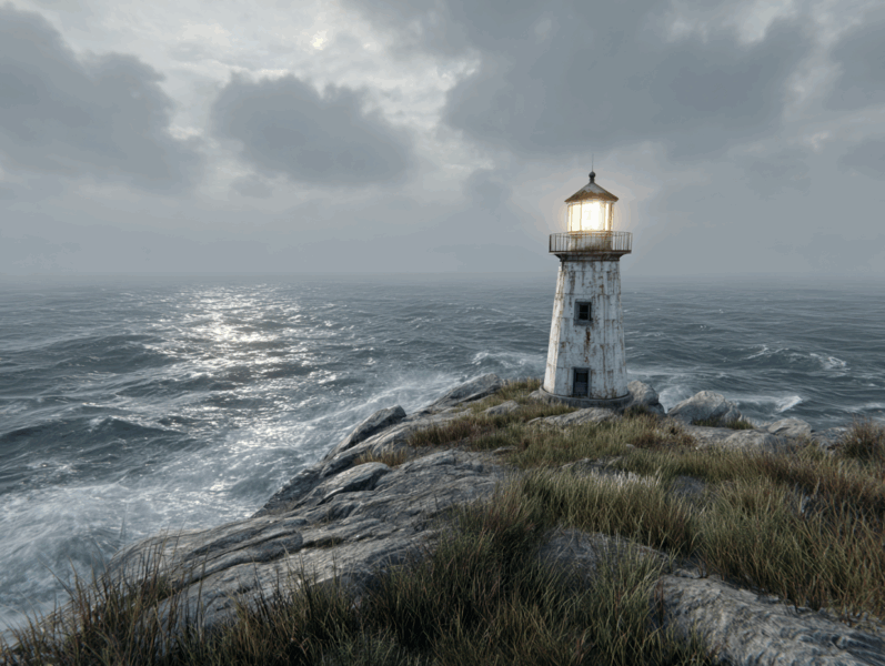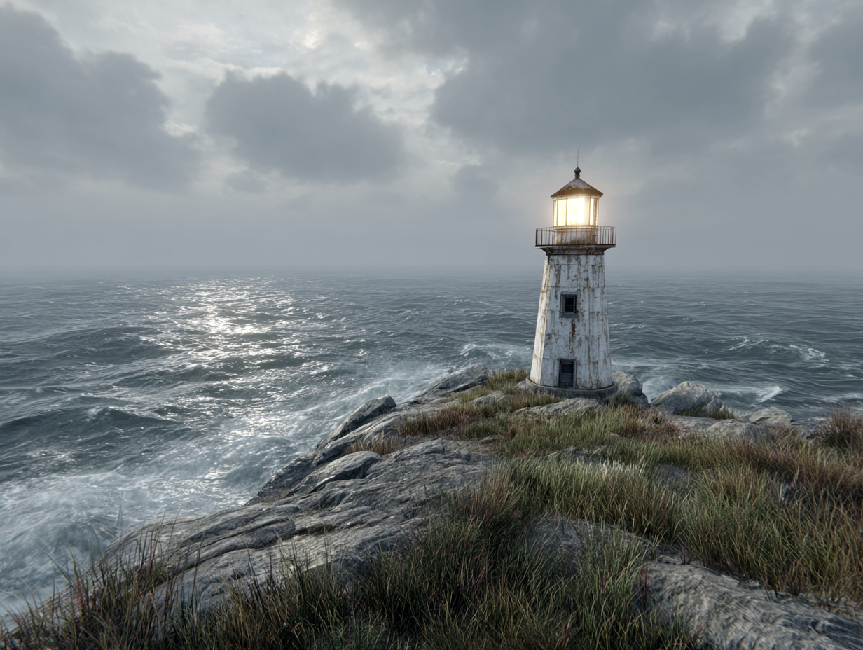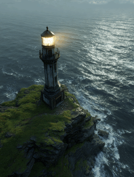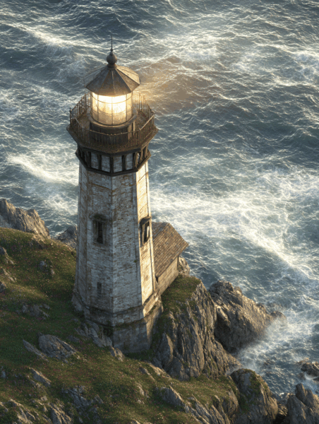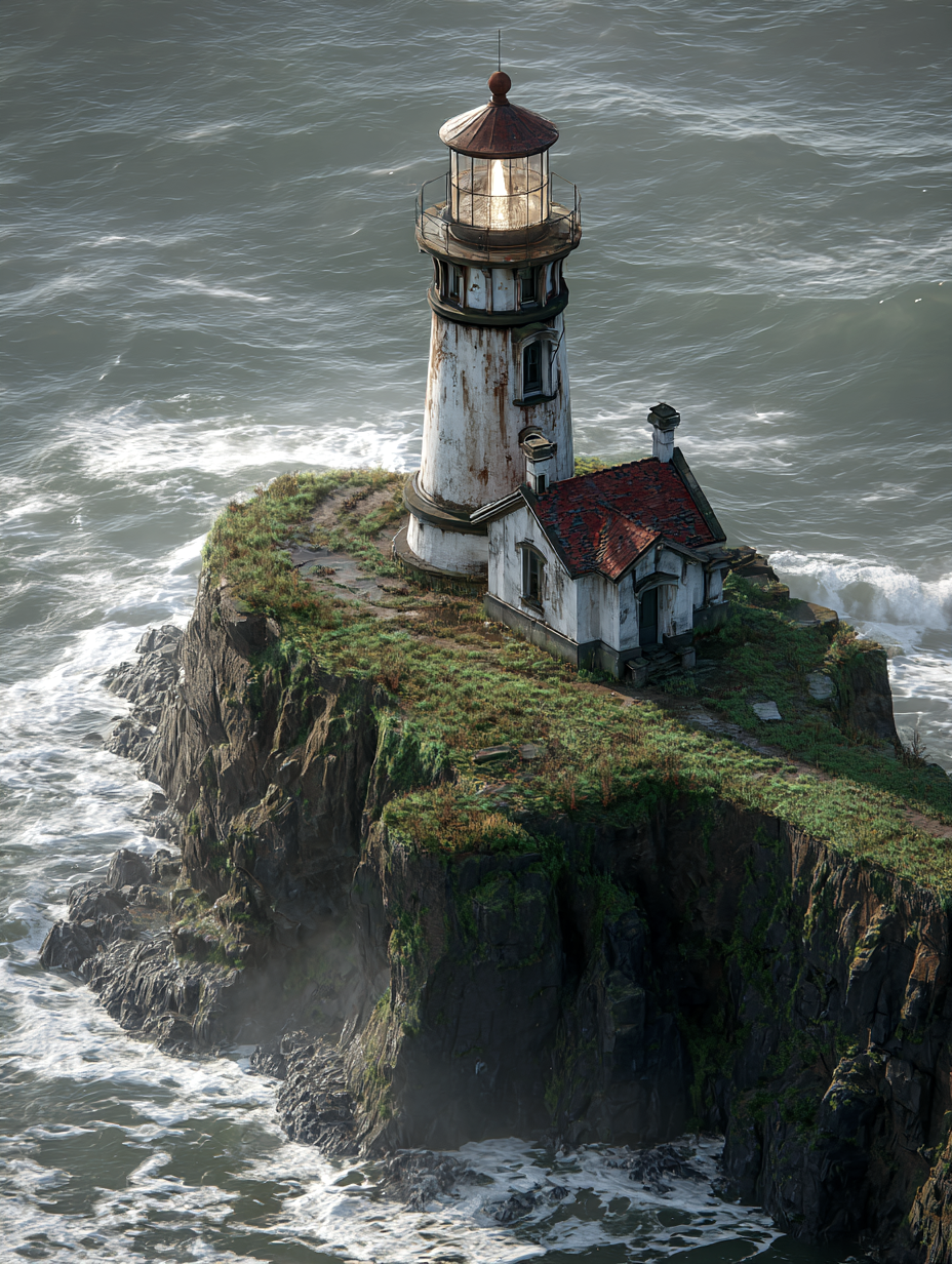 An isolated, dramatic lighthouse and keeper's cottage sitting atop a rugged, grassy sea stack or cliff island, surrounded by stormy, churning grey ocean waves. High-angle, aerial perspective shot (drone view). The lighthouse lamp is brightly lit, casting a warm glow. Moody, overcast lighting, photorealistic, cinematic volumetric light, ultra-detailed texture, weathering, moss on the cliff, cinematic photography, depth of field, 8k resolution, professional render.