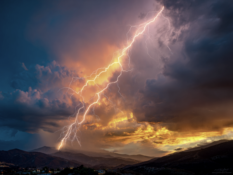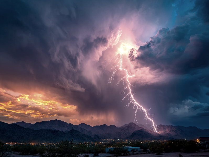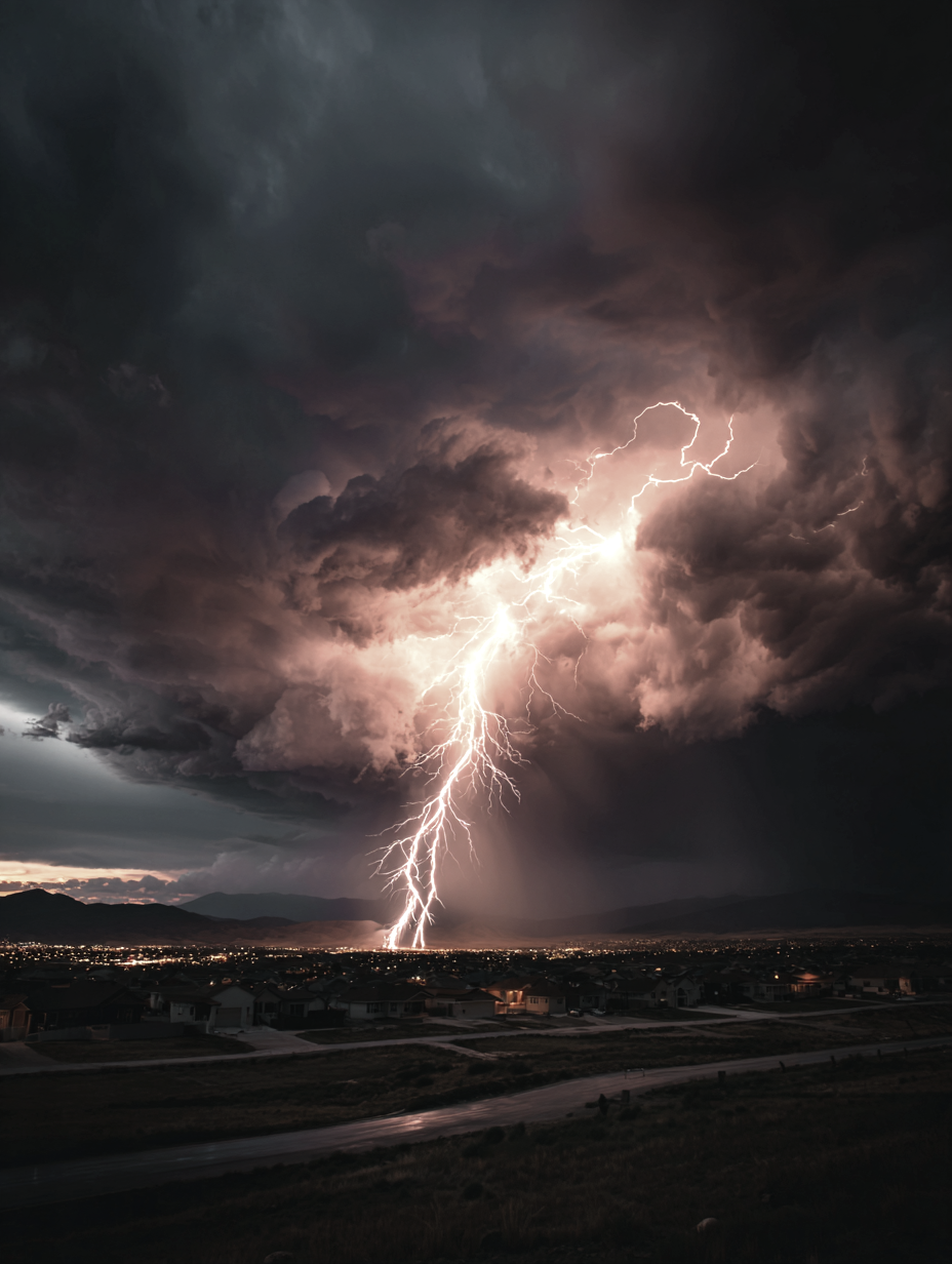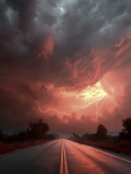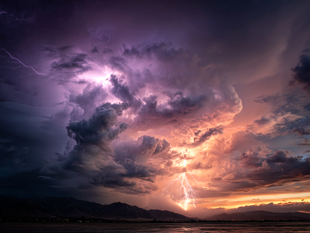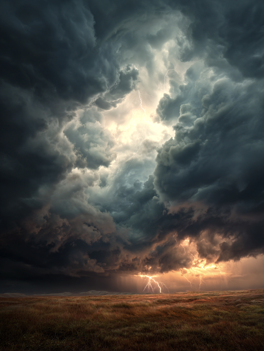 A vast stormy sky over a desolate wilderness, distant horizon filled with ominous disaster, massive dark thunderclouds swirling with charged energy, supercell storm structure, dramatic lightning bolts flashing near the horizon, purple and deep blue storm clouds contrasted with fiery orange and golden light breaking through the storm, faint golden glow piercing the clouds symbolizing mystery and hope, cinematic composition, epic scale, ultra-photorealistic, highly detailed clouds, visible atmospheric energy, volumetric lighting, high contrast, dramatic shadows, long exposure lightning, 8k resolution, HDR, natural realism, awe-inspiring and mystical mood --ar 16:9 --v 6 --style raw