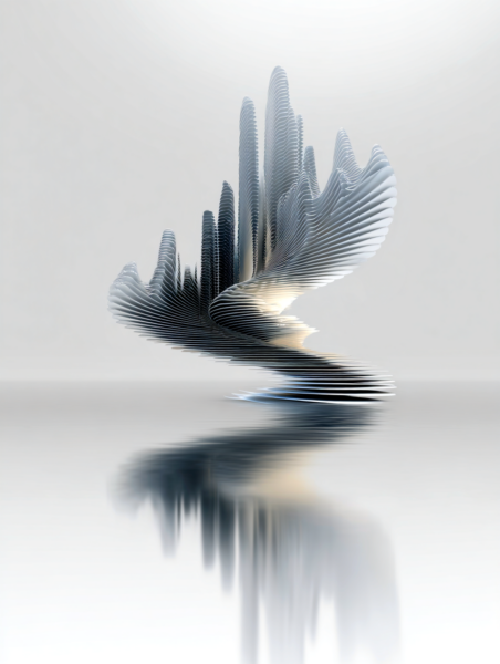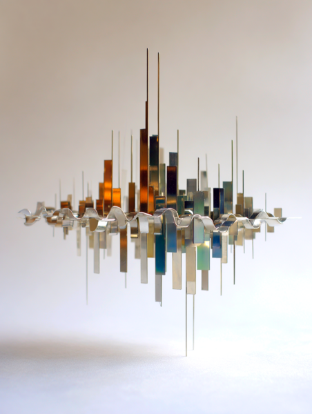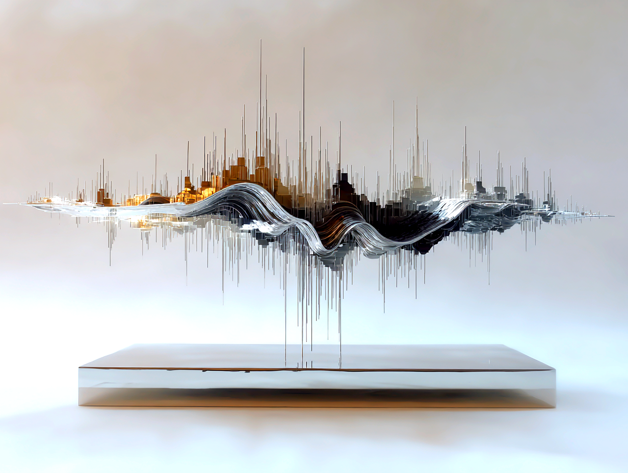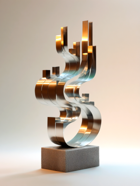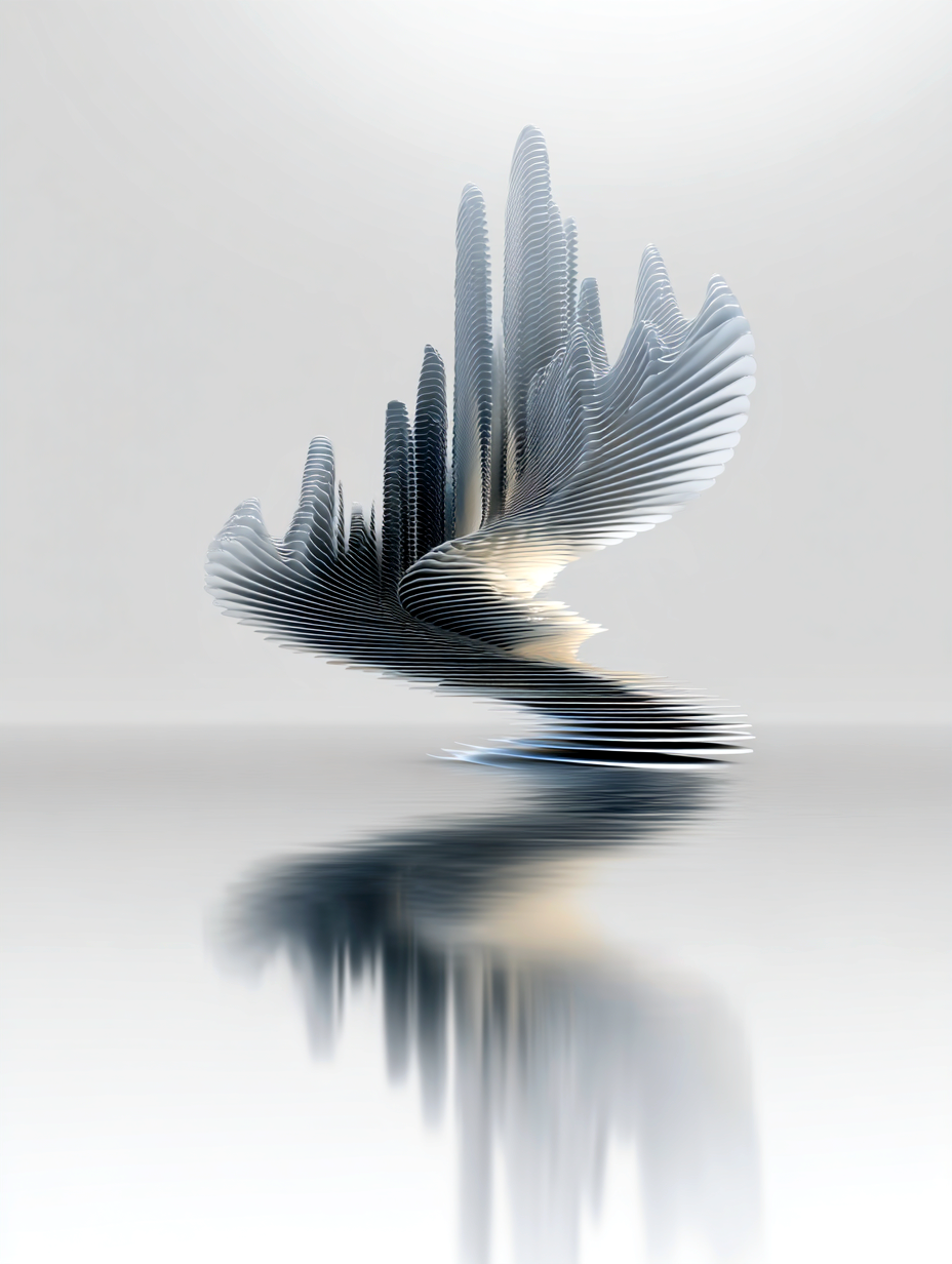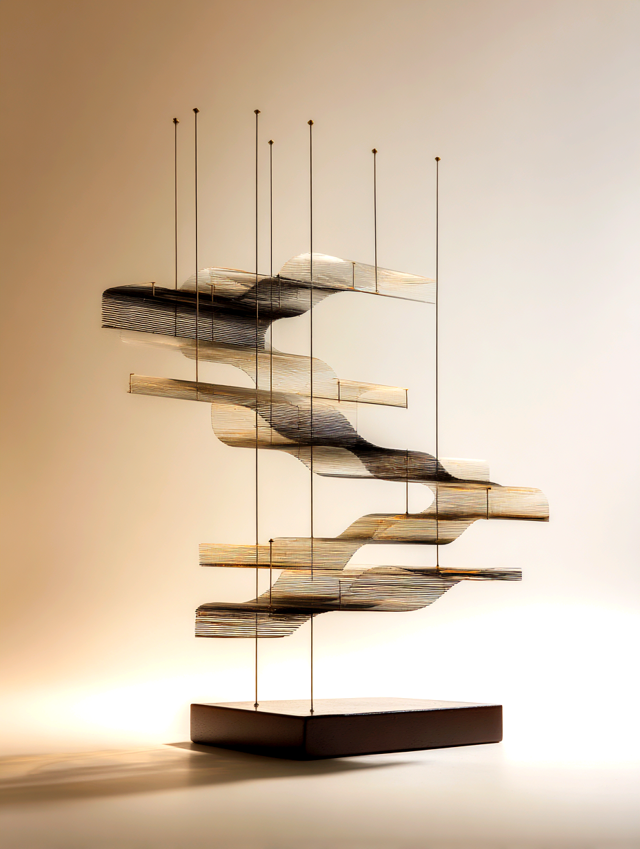 超精緻な抽象現代金属彫刻。ランダムな波形変化と繊細な弧を描く、浮遊する多層平行構造。薄いステンレス鋼の長方形パネルで構成され、反射面、シャープでクリーンなエッジ、左右対称の水平構成。層を貫く輝く地平線は、温かい黄金色の光を放つ夜の都市のスカイラインを思わせる。垂直スライスに埋め込まれた水面と空の反射、ネガティブスペースの巧みな活用。磨き上げられた黒色のジェットストーンの台座の上に浮かぶ。最小限の支持構造、映画のような照明、柔らかなスタジオ反射、温かみのある光とクールな金属トーンのコントラスト、現代ミニマリストアート、ギャラリー展示設定、クリーンな白い背景、フォトリアリスティック、超高解像度、8K、被写界深度、レイトレーシング反射 --ar 16:9 --v 6 --style raw --q 2