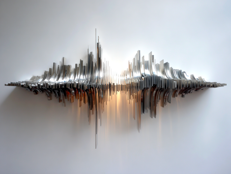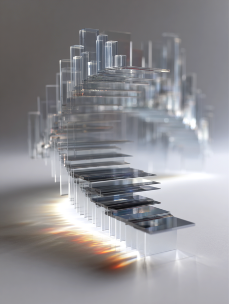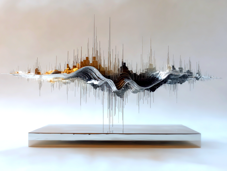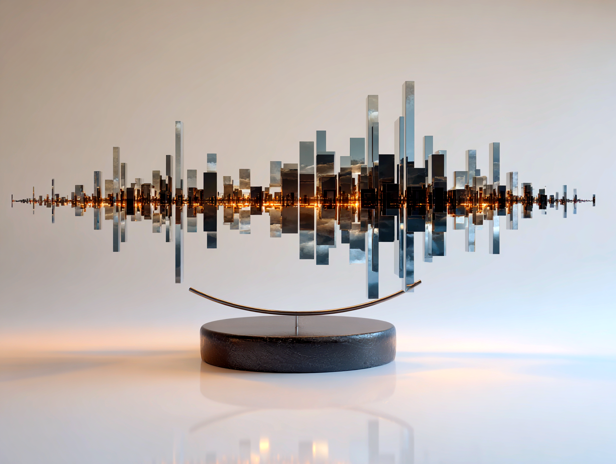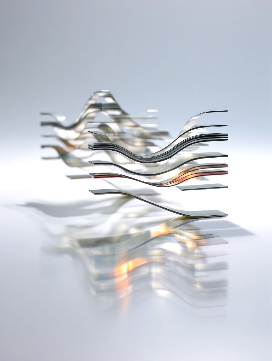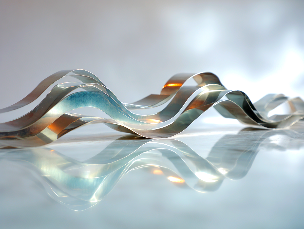 超精緻な抽象現代金属彫刻。ランダムな波形変化と繊細な弧を描く、浮遊する多層平行構造。薄いステンレス鋼の長方形パネルで構成され、反射面、シャープでクリーンなエッジ、左右対称の水平構成。層を貫く輝く地平線は、温かい黄金色の光を放つ夜の都市のスカイラインを思わせる。垂直スライスに埋め込まれた水面と空の反射、ネガティブスペースの巧みな活用。磨き上げられた黒色のジェットストーンの台座の上に浮かぶ。最小限の支持構造、映画のような照明、柔らかなスタジオ反射、温かみのある光とクールな金属トーンのコントラスト、現代ミニマリストアート、ギャラリー展示設定、クリーンな白い背景、フォトリアリスティック、超高解像度、8K、被写界深度、レイトレーシング反射 --ar 16:9 --v 6 --style raw --q 2