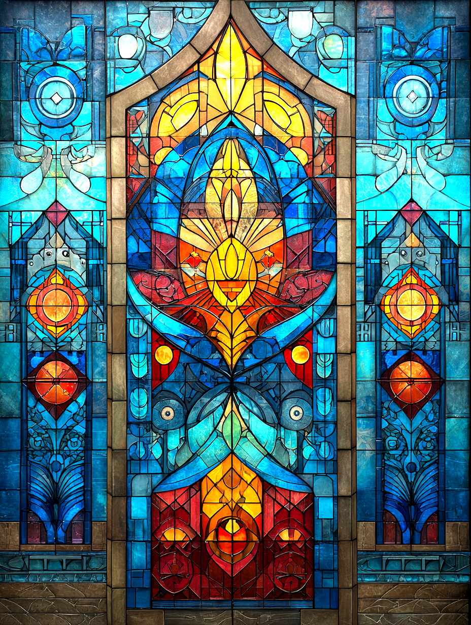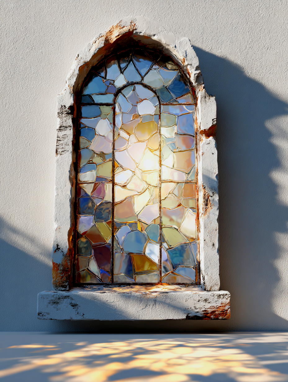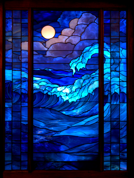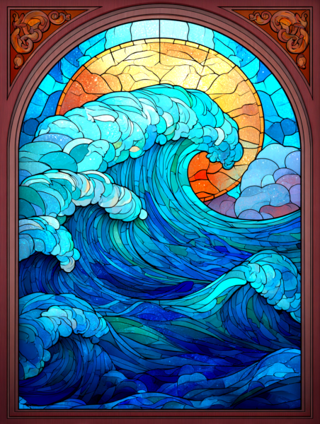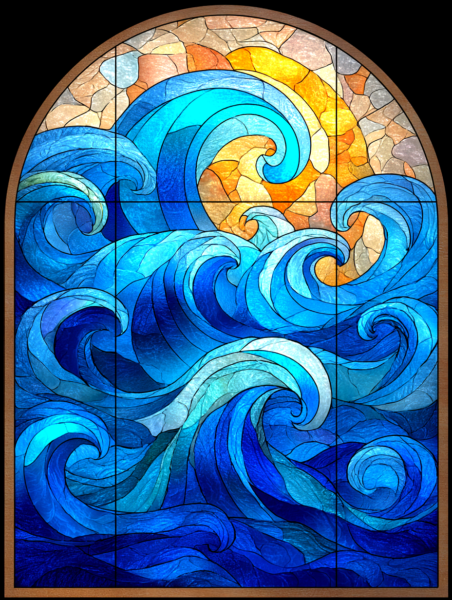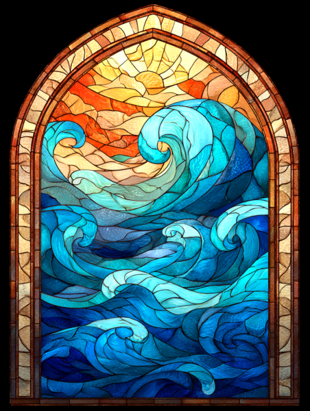 A highly detailed stained glass artwork depicting powerful Pacific Ocean waves, composed of large, irregular glass pieces with visible lead cames, set within a tall arched church-style window frame. Dynamic swirling waves in layered shades of deep blue, turquoise, and aqua dominate the lower and middle sections, with curling crests and flowing motion. Above the waves, a warm glowing sky with golden, amber, and soft orange glass pieces, suggesting sunlight breaking through clouds. Rich texture of handcrafted stained glass, translucent glass with light shining through, subtle imperfections and glass grain visible. Symmetrical vertical composition, centered window, dark background surrounding the arch. Fine art, cathedral stained glass style, high contrast lighting, luminous, ornate, ultra-detailed, realistic glass reflections, no people, no text.