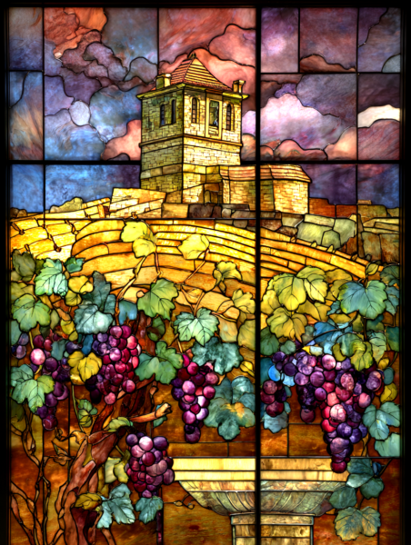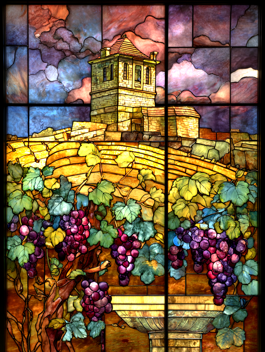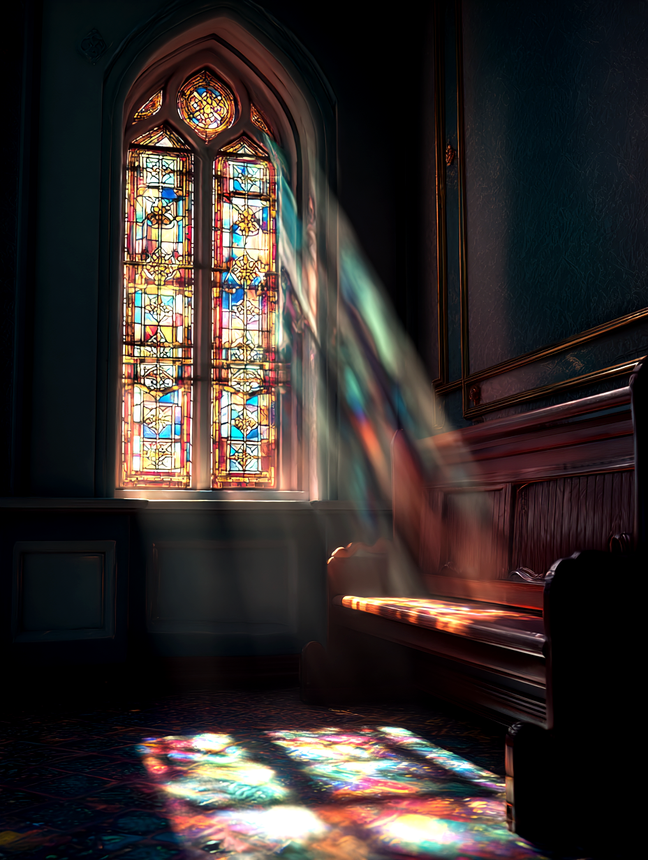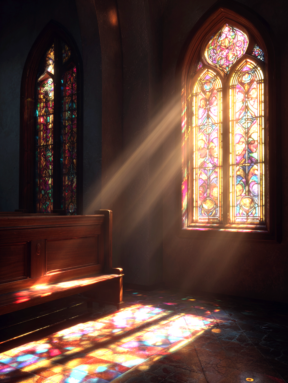 A highly detailed stained glass artwork depicting powerful Pacific Ocean waves, composed of large, irregular glass pieces with visible lead cames, set within a tall arched church-style window frame. Dynamic swirling waves in layered shades of deep blue, turquoise, and aqua dominate the lower and middle sections, with curling crests and flowing motion. Above the waves, a warm glowing sky with golden, amber, and soft orange glass pieces, suggesting sunlight breaking through clouds. Rich texture of handcrafted stained glass, translucent glass with light shining through, subtle imperfections and glass grain visible. Symmetrical vertical composition, centered window, dark background surrounding the arch. Fine art, cathedral stained glass style, high contrast lighting, luminous, ornate, ultra-detailed, realistic glass reflections, no people, no text.