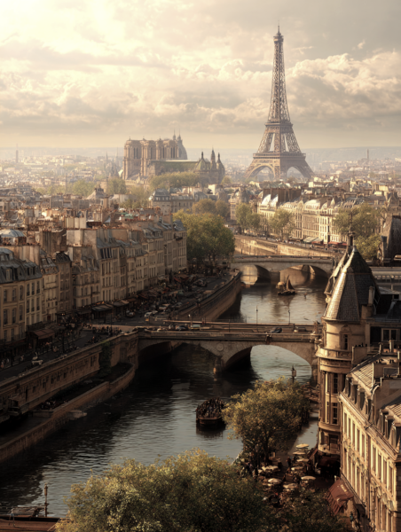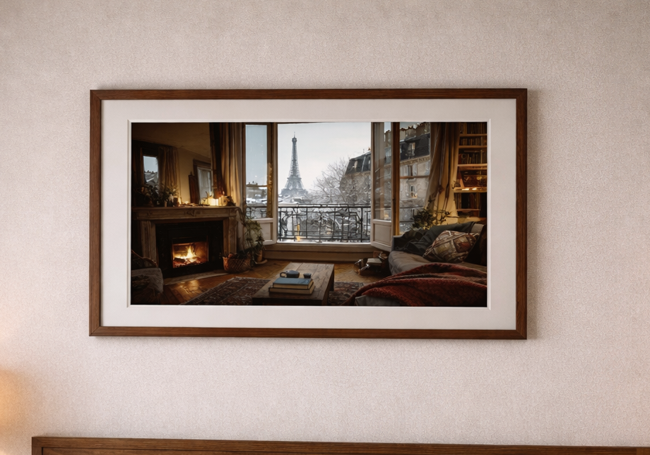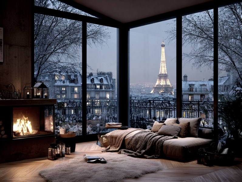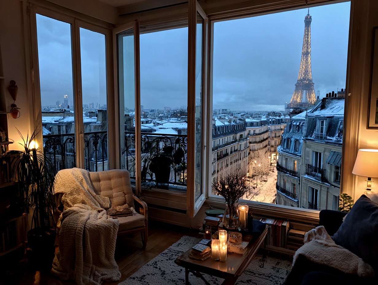 A cozy Parisian apartment interior in winter, warm cinematic atmosphere. View from inside a living room looking out through large open French windows onto the Eiffel Tower in the distance. Snow-covered Paris rooftops and bare winter trees outside, soft overcast daylight, light snowfall mood. Inside: a lit fireplace with glowing fire, wooden mantel with candles, books and small plants, herringbone wooden floor. A rustic wooden coffee table with stacked books and a mug, textured Persian-style rug. Comfortable sofa with blankets and cushions, bookshelves on the side, natural lived-in elegance. Warm interior lighting contrasting with cold blue-gray winter exterior. Photorealistic, ultra-detailed, cinematic composition, shallow depth of field, natural color grading, cozy hygge aesthetic, European interior design. Shot on full-frame camera, 35mm lens, f/2.8, high dynamic range, soft shadows, realistic reflections.