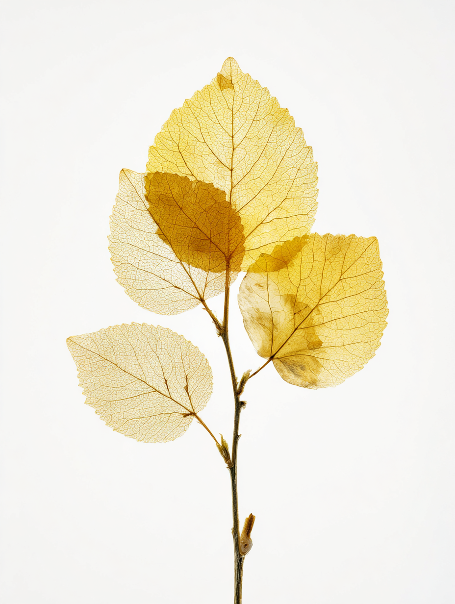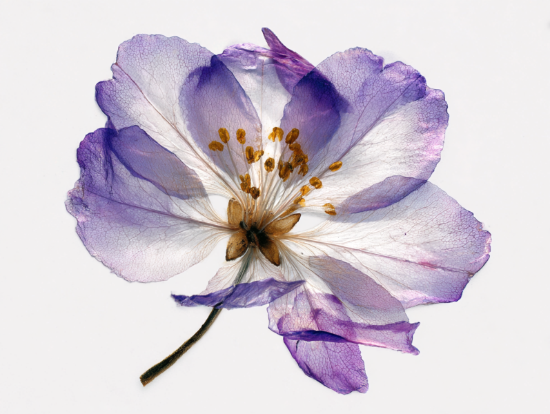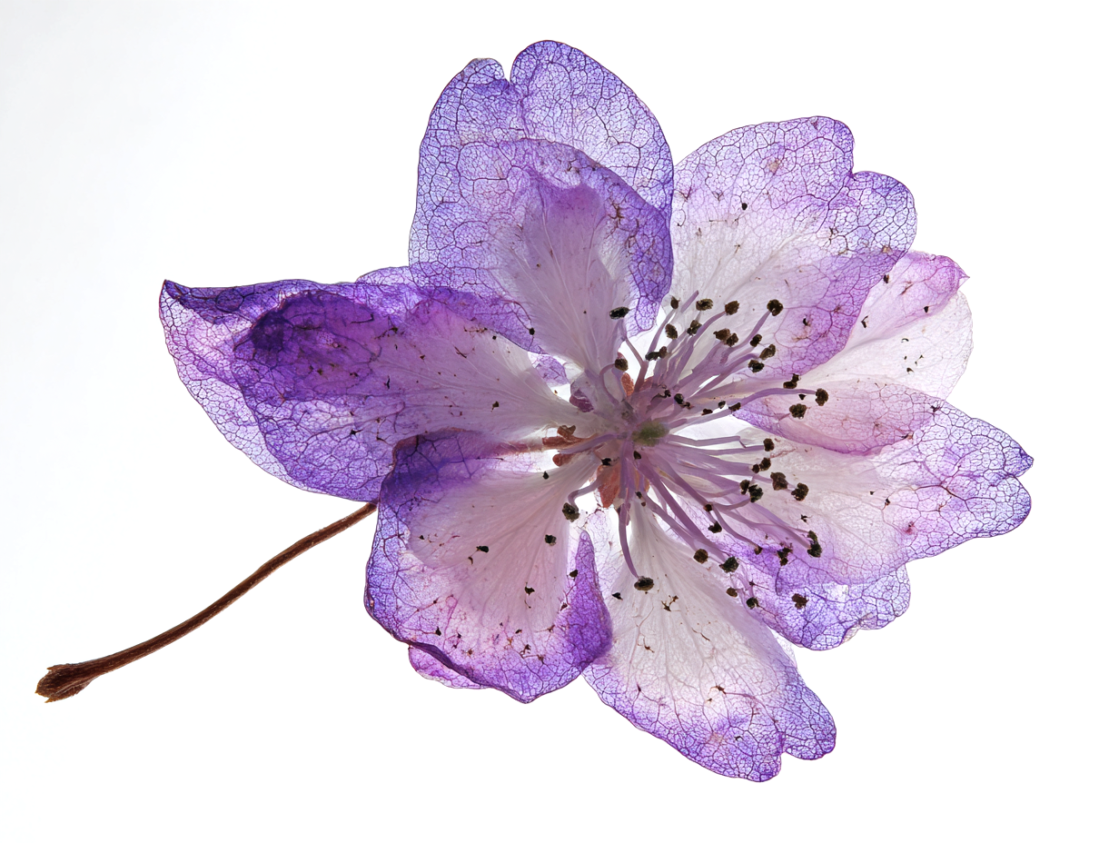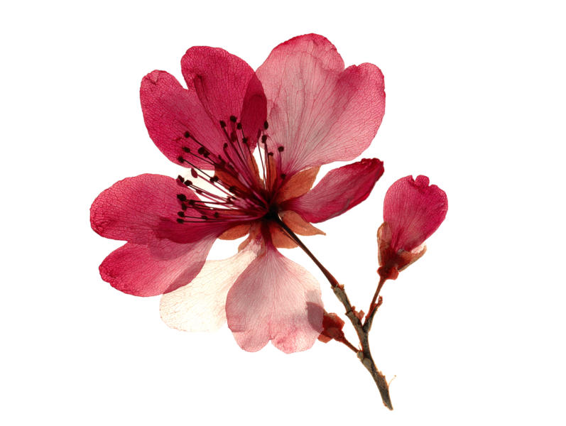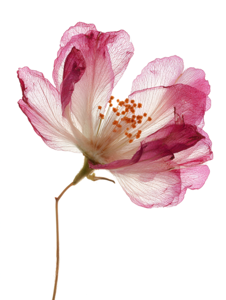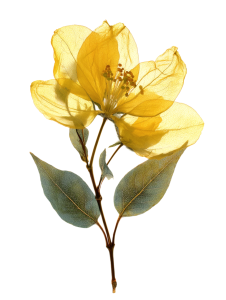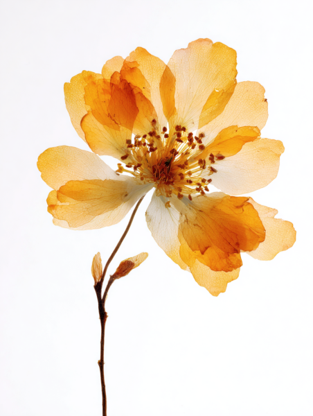 超リアルな押し花標本、春に咲いた一輪の花、半透明のオレンジイエローの花びらに微妙な白のグラデーション、繊細な葉脈が見える、やや乾燥した質感、2 つの小さなつぼみが付いた細い茶色の茎、植物標本スタイル、純白の背景に分離、ハイキー照明、背後から柔らかく拡散したスタジオ ライトが花びらを透過する光を作り出す、マクロ撮影、極限まで詳細に描写、写実的、シャープなフォーカス、自然なカラー グレーディング、最小限の構図、科学的な植物学ドキュメント スタイル