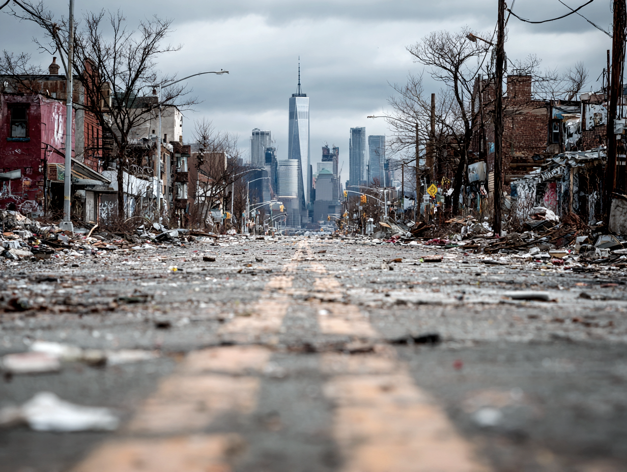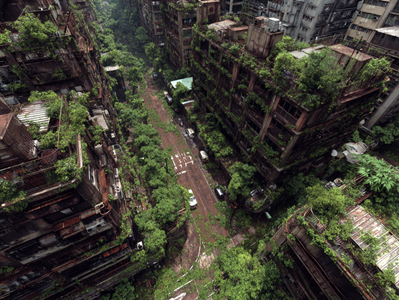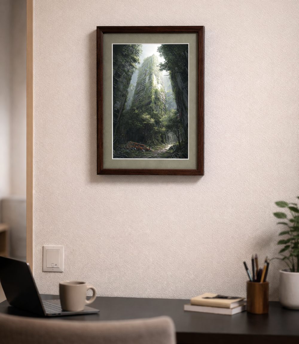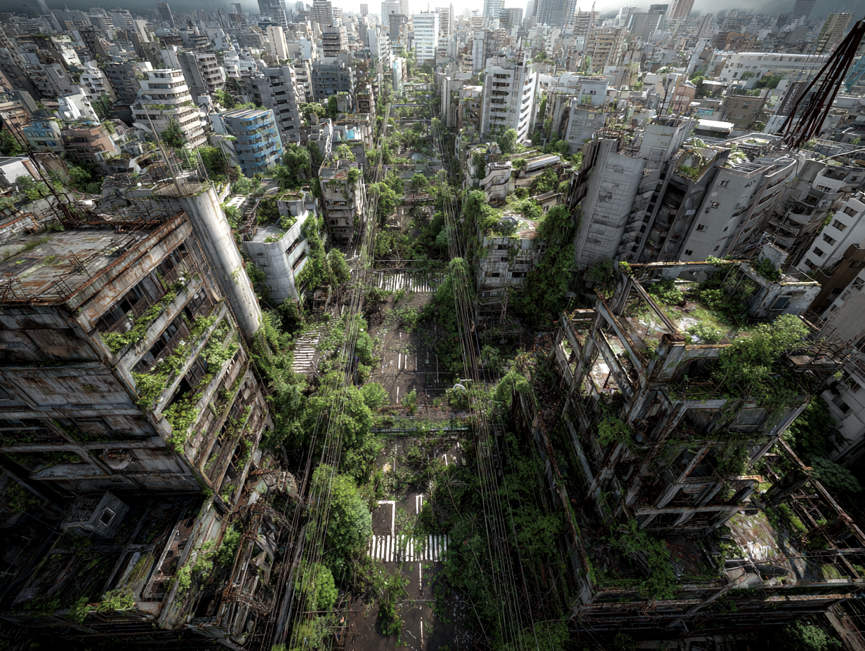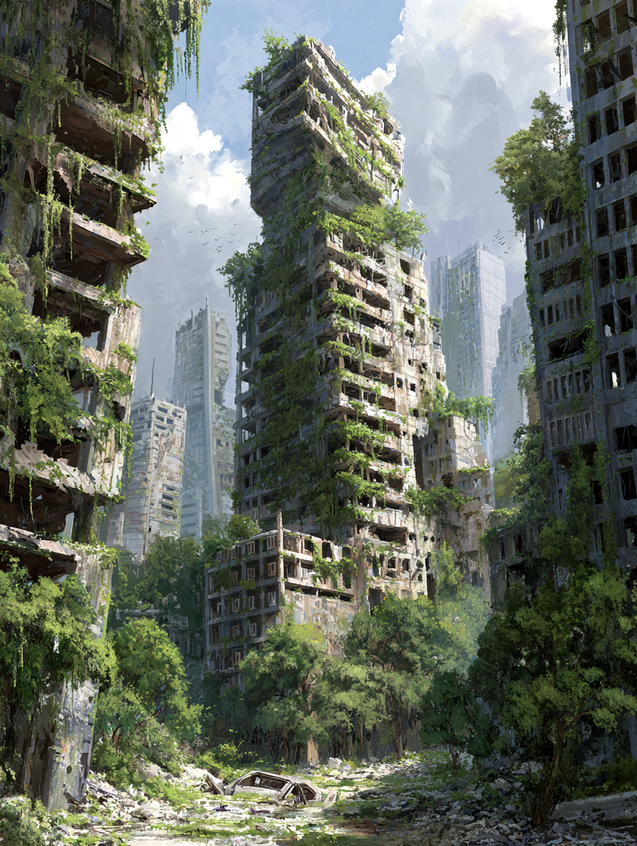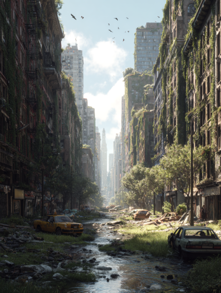 Post-apocalyptic New York City, humanity extinct, towering skyscrapers reclaimed by nature, massive high-rise buildings covered in dense green vines and moss, trees growing from broken concrete and windows, abandoned urban canyon street filled with debris, a rusted commercial van left behind on the road, wet surfaces after rain, thick mist slowly clearing, soft diffused light, cinematic atmosphere, melancholic and serene mood, nature overtaking civilization, highly detailed ruins, crumbling concrete, shattered glass, overgrown vegetation everywhere, photorealistic, ultra-realistic textures, dramatic scale, depth and perspective, shot on a full-frame DSLR, ultra-wide angle lens, low angle looking up between skyscrapers, shallow atmospheric haze, film still, cinematic color grading, 8k detail, realistic lighting, global illumination