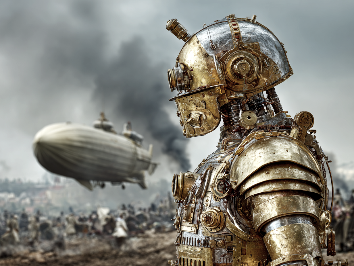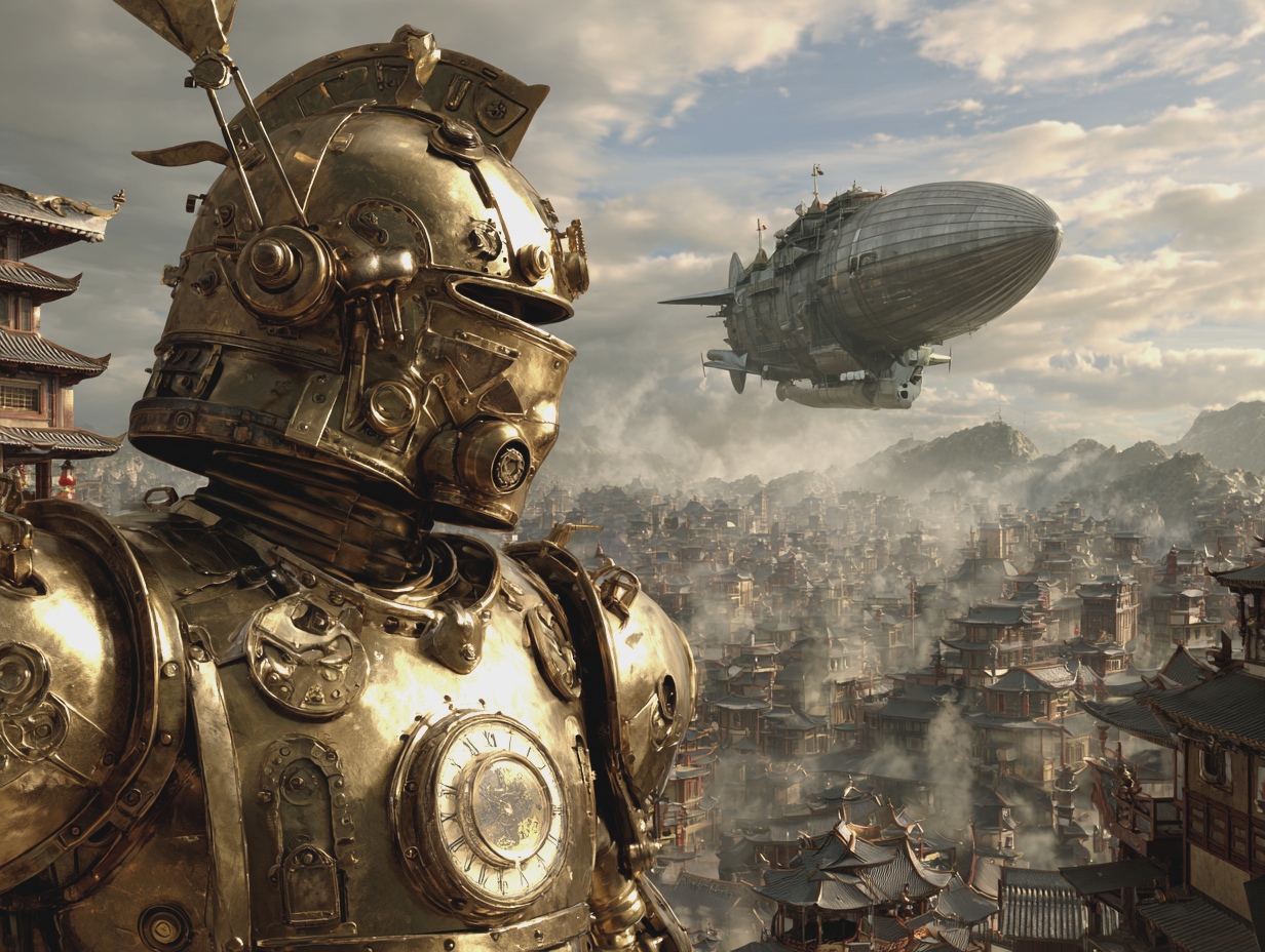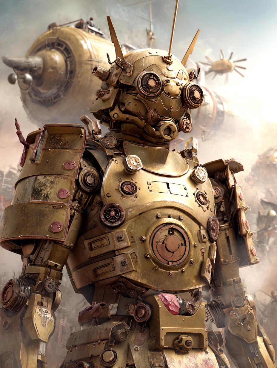 A majestic, colossal Steampunk Robot Warrior clad in intricate **bronze and brass armor**, featuring Neo-Victorian fantasy elements. A large combat scanner is embedded in the chest plate, glowing blue. A gigantic, submarine-shaped Steampunk airship floats in the smoky sky above a sprawling, dust-choked battlefield. The lighting is cinematic and dramatic. **High detail, ultra-realistic, highly detailed mechanisms, octane render.** --ar 16:9 --style raw