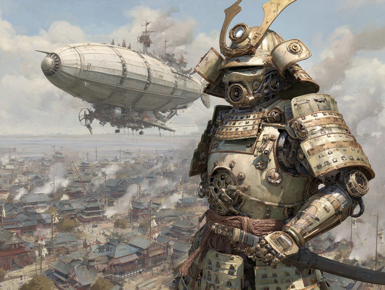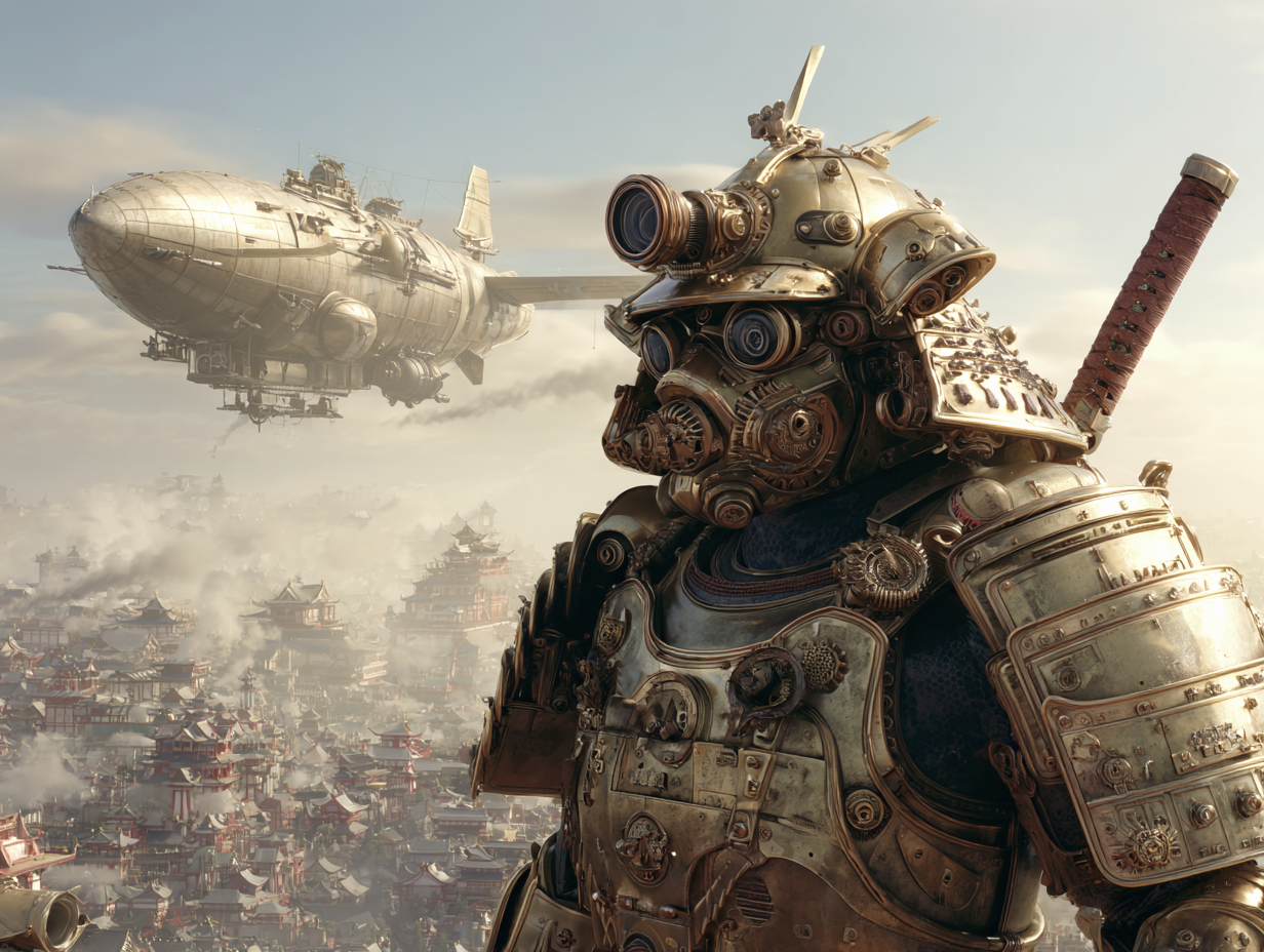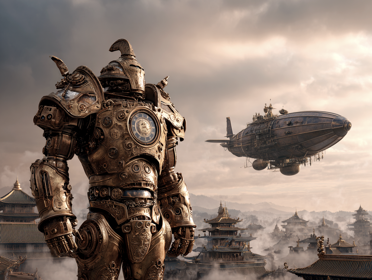A majestic, colossal Steampunk Robot Warrior clad in intricate **bronze and brass armor**, featuring Neo-Victorian fantasy elements. A large combat scanner is embedded in the chest plate, glowing blue. A gigantic, submarine-shaped Steampunk airship floats in the smoky sky above a sprawling, dust-choked battlefield. The lighting is cinematic and dramatic. **High detail, ultra-realistic, highly detailed mechanisms, octane render.** --ar 16:9 --style raw