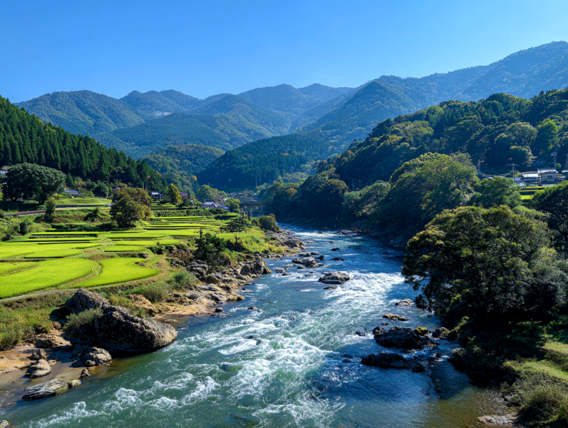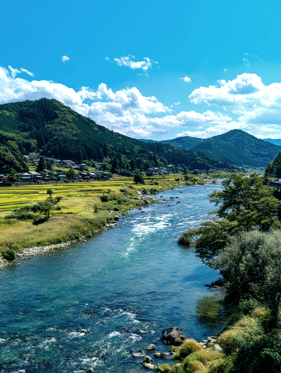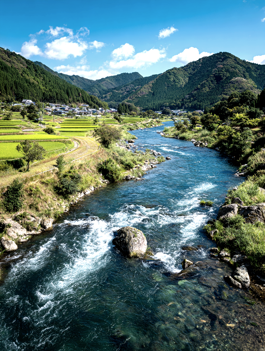 A nostalgic Japanese summer countryside scene from the Showa era, a gentle wide river flowing from lush green mountains, crystal-clear water with visible river stones, sparkling sunlight on the water surface, terraced rice fields with vibrant green rice plants, a quiet rural village nestled at the foot of the mountains, traditional Japanese houses, deep green forests, clear blue sky with soft white clouds, peaceful and idyllic atmosphere, natural colors, highly detailed landscape photography, ultra realistic, cinematic composition, summer light, calm and serene mood, Japan rural scenery, 8k, masterpiece