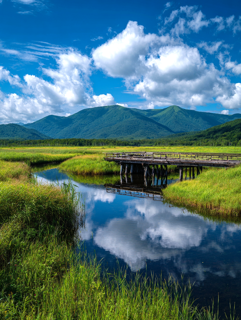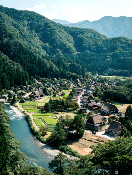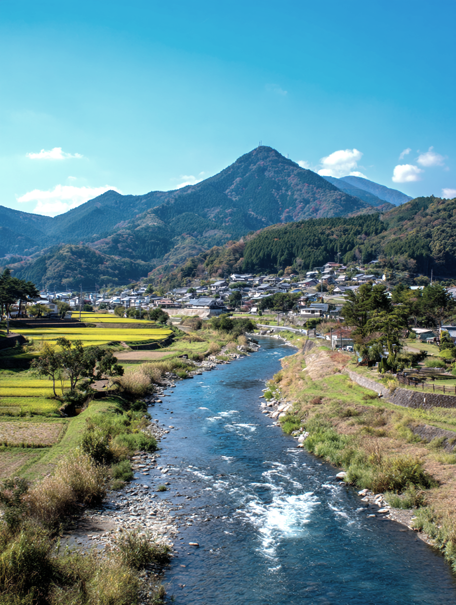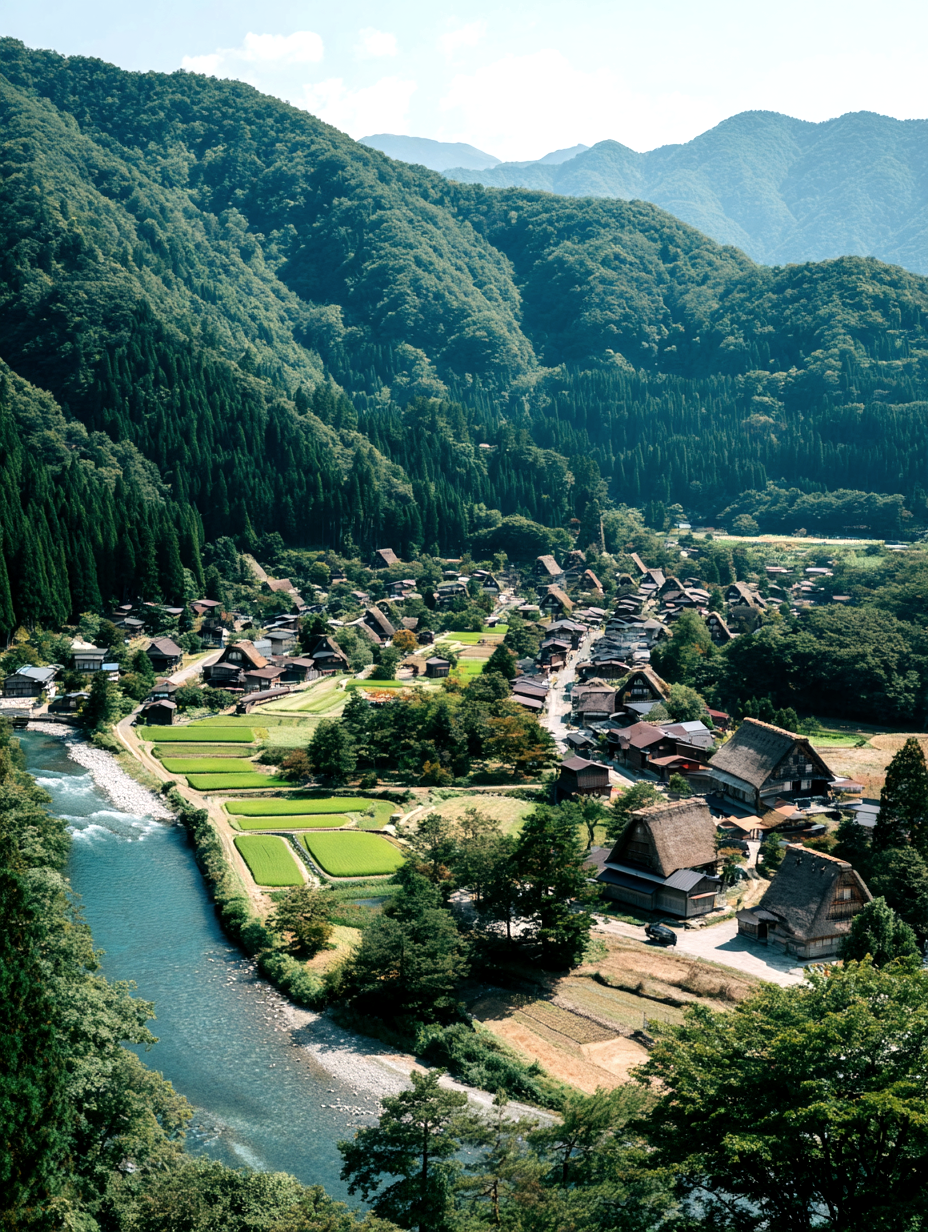 A nostalgic Japanese summer countryside scene from the Showa era, a gentle wide river flowing from lush green mountains, crystal-clear water with visible river stones, sparkling sunlight on the water surface, terraced rice fields with vibrant green rice plants, a quiet rural village nestled at the foot of the mountains, traditional Japanese houses, deep green forests, clear blue sky with soft white clouds, peaceful and idyllic atmosphere, natural colors, highly detailed landscape photography, ultra realistic, cinematic composition, summer light, calm and serene mood, Japan rural scenery, 8k, masterpiece