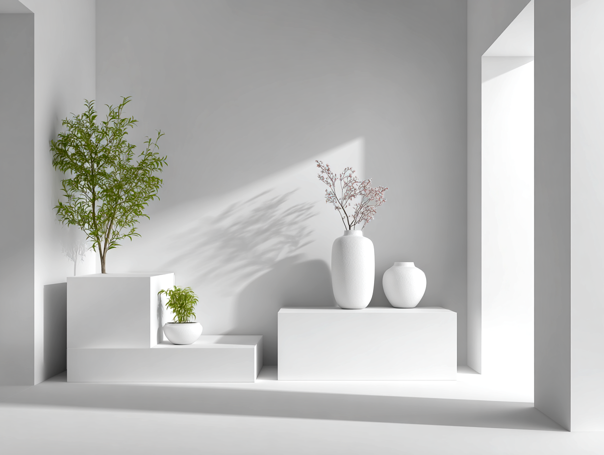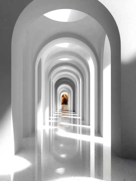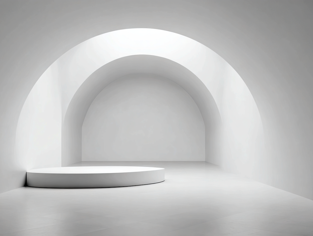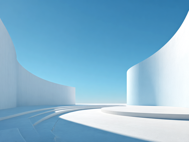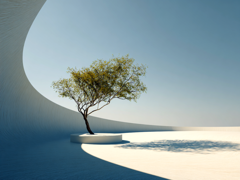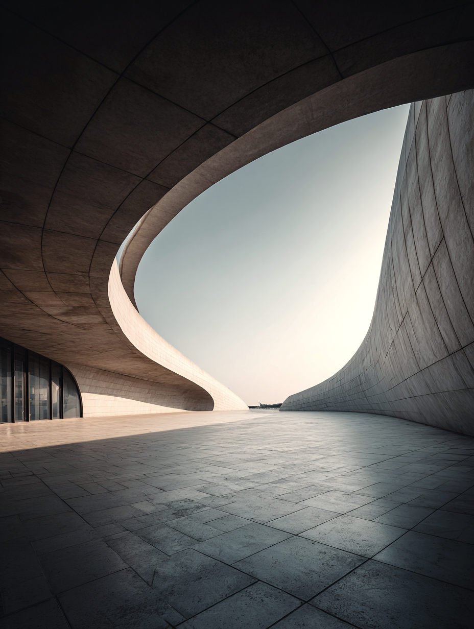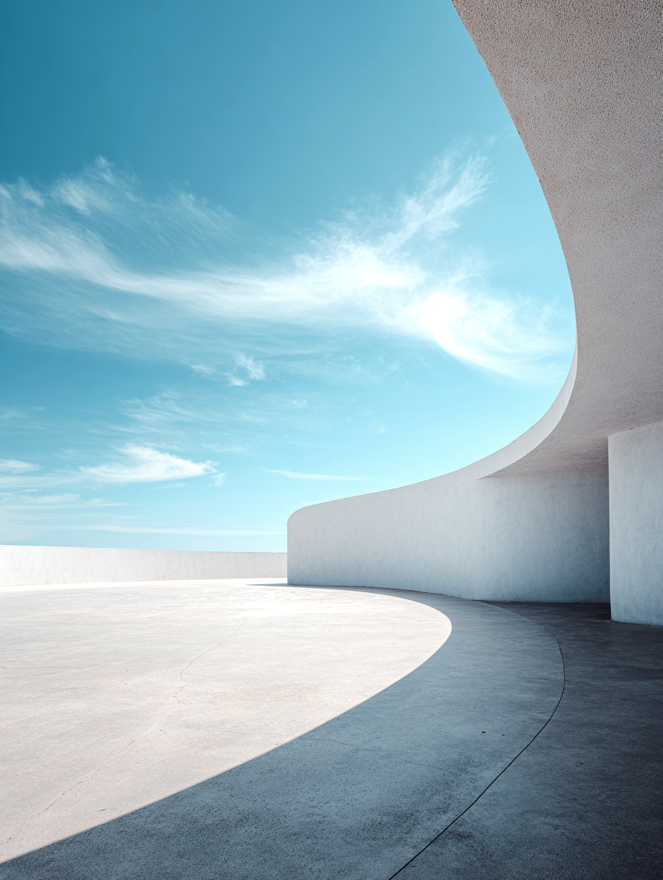 A minimalist concrete courtyard architecture, serene and zen-inspired, smooth flowing curved concrete walls forming an enclosed courtyard, walls gently blending into a pale blue sky, seamless and sculptural design. A single solitary tree planted at the center on a circular concrete platform, symbol of calm and balance. Soft natural materials, minimal details, no people. Morning sunlight at 10am casting gentle yet clear contrasts of light and shadow across the floor and walls. Peaceful, contemplative atmosphere, Japanese zen aesthetic, modern architectural photography, ultra-clean composition, soft shadows, high realism, 4K resolution, cinematic lighting, wide-angle view, minimalist design, tranquil mood.