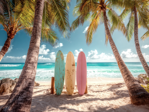 【無料のAI画像】ハワイの風を感じる一枚|パステルカラーのサーフボードが彩る癒やしのビーチシーン新着!!
