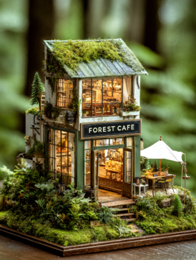 森の中にぽつんと置かれた「フォレストカフェ」は、AIが生成したジオラマ写真なんです。緑の屋根と大きな窓が特徴的で、木目調の壁とのコントラストが最高にオシャレですよね。 ちょっと感動したのがこのリアルさ。芝生や木のテクスチ […]