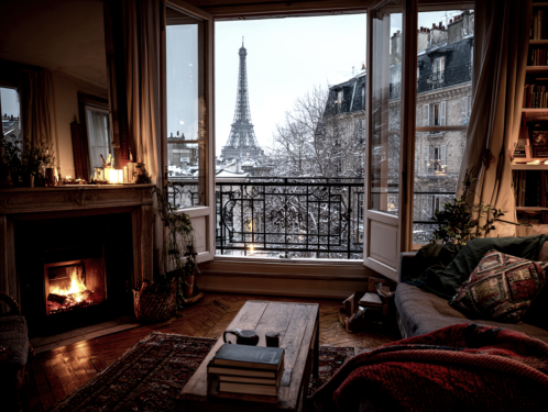 【無料のAI画像】雪の降るパリの休日 暖炉とエッフェル塔を眺めながら「究極のヒュッゲ」の時間を過ごす新着!!