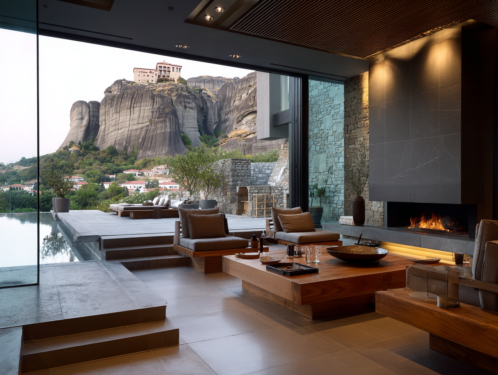【無料のAI画像】メテオラの絶景と融合したモダン建築が織りなす至高の隠れ家新着!!